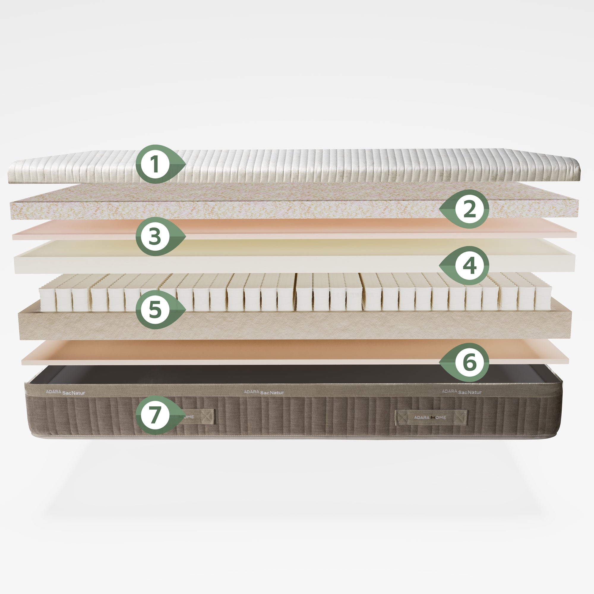 Para los fans de los muelles ensacados y los materiales naturales en Adara Home hemos creado un colchón de confort excepcional e incomparable: Nuevo Colchón Adara Sac Natur. Su perfecta composición nos brinda una comodidad gloriosa: se trata de un sistema de muelles ensacados cubiertos por espuma SuperSoft, Viscoelástica, fibra de Lana 100% Merino y un tejido BIO de Lino y Viscosa.